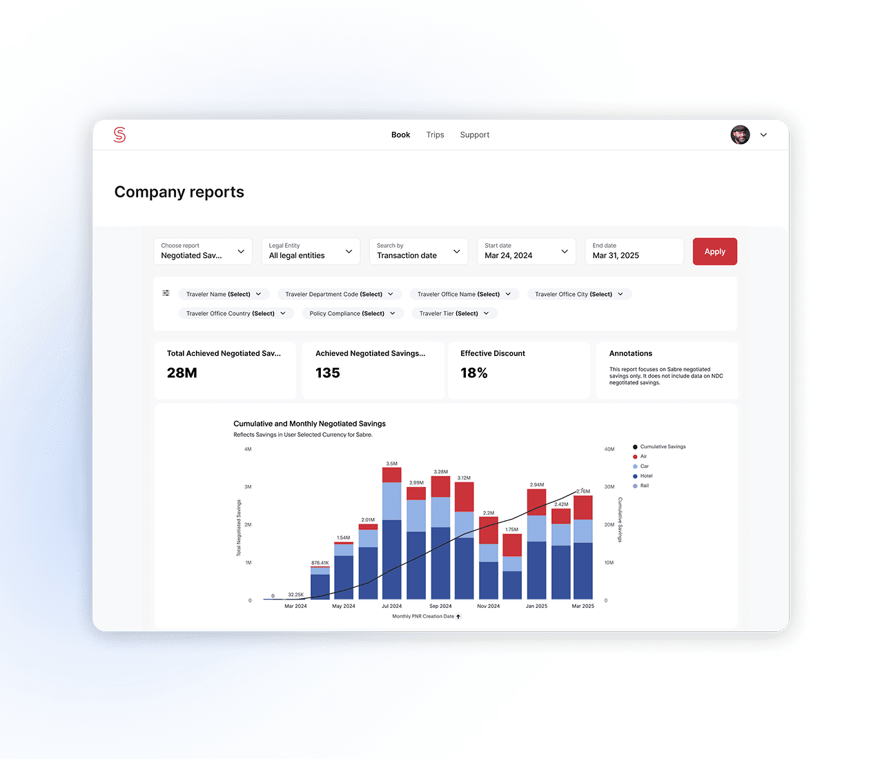Gain real-time insights into travel spend, program savings, traveler behavior, and more, with out-of-the box reports and self-service report creation.